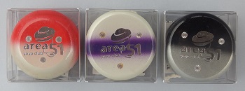 One three-jeweled BC imperial-shaped wooden yo and two three-jeweled BC concave-shaped wooden yo-yos, all with the Area 51 yo-yo club on the side.