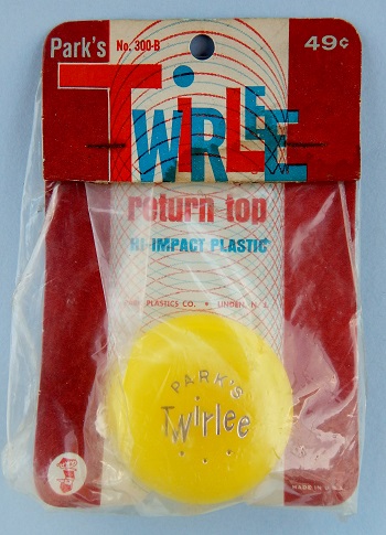Made by Parks Plastic Co. of Linden, NJ. Made in USA. Standard size yo-yo in a very bright lemon yellow color. Made of "Hi-Impact Plastic". Originally sold for 49 cents. No. 300-B. There is no printing on the back side of the package.