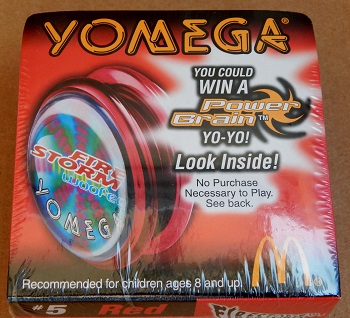 "With the purchase of any Yomega/McDonald's X-Brain or Firestorm for $2 (food purchase necessary), you could be the proud new owner of a Power Brain. Inside every package looms the chance of winning this new generation of yo-yo."