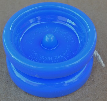 YoYoJam's very first production yo-yo. This freshmen release came with an instruction sheet, and enclosed in a clear plastic envelope. Has adjustable string gap, ball bearing axle, and polycarbonate body. Note that this first version is blue and did not have sidecaps; later versions were red or black and included sidecaps.