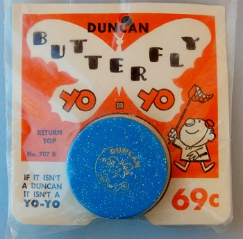 This butterfly was put onto an alternate versioned card labeled as No. 707 B. The front of the card has a slightly different overall design compared to the overall design on model No. 707 also seen in this museum. For example, the back of this No. 707 B card does not have any printing while No. 707 has printing. Perhaps the "707 B" meant "blank" or "blank back." Duncan literature from this time period suggests that it stood for bagged or poly-bagged. The yo-yo model is identical for both versioned cards. Originally sold for 69¢. Blue lacquer with aluminum flecked finish.