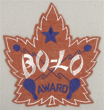 Bo-Lo was the brand name used by Cheerio for their paddleball line. The similarity to some of the Cheerio Yo-Yo patches from the era is very apparent. Many Cheerio items showed a maple leaf on the logo, and this Bo-Lo patch is maple leaf shaped. Much of the detailing is also exactly like some of the Cheerio yo-yo patches. A thick felt backing with embroidered borders, designs, and lettering.