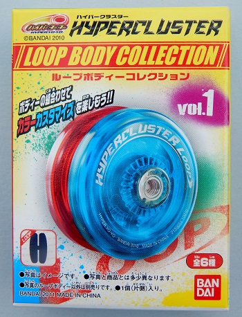 As the name suggests, this yo-yo had a modified shape body (rounded rims, weighted on the perimeter) designed for looping. These were sold only through authorized Bandai Hyper Yo-Yo dealers. There were six body colors available with just one half of a yo-yo body available per box. To get a complete body, you had to purchase two boxes. In addition, the boxes were blind, meaning you couldn't see the color of the body you were purchasing; it was entirely random. If you were determined to get the "rare", glow-in-the-dark looping body, you had to continue purchasing boxes until you got two of the same halves. Your chances of getting a single glow body halve were about one in ten. In most cases, you ended up with two different colored halves, similar to what is shown on the product's box. Note that these were body halves only. To complete the entire yo-yo you needed the other body halve and three other parts: a core, a bearing, and string. You could purchase those parts separately or you could use the parts from most any other HyperCluster series yo-yo set.