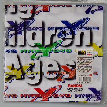 Hyper Yo-Yo bandana in white with Hyper Yo-Yo logo printed in different colors. Japanese players sometimes wore the cloth around their head or neck to stand-out from other players. The phrase "A World of Fun on a String for Children of All ages" is watermarked behind the colored logos. The Hyper Yo-Yo label on the packaging and the mini image of the full-size bandana directly above the UPC, are both peel-off stickers. Made by Bandai's Apparel Division.