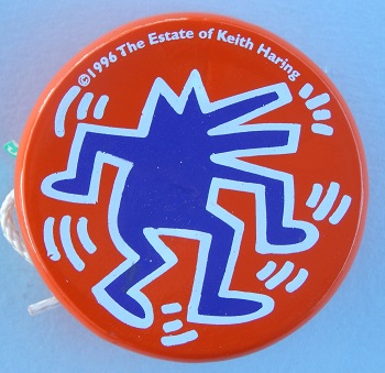 This wooden yo-yo was made by Vilac of France. The "Human Animal" figure with arms, legs, body, two pointed ears on the top of the head, and an elongated mouth is by Keith Haring. The figure was originally created in 1986. Opposite side is blank.