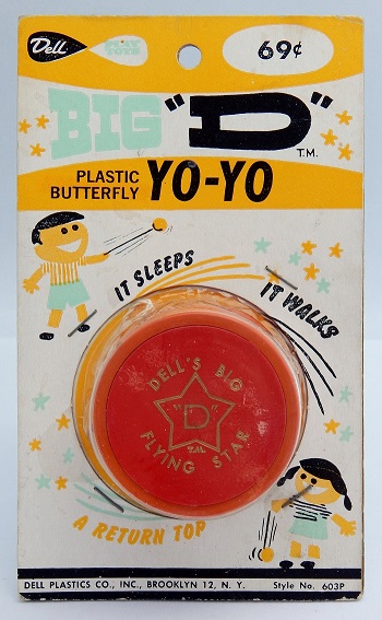 An early Dell butterfly configured yo-yo. The packaging uses the word "yo-yo" on it, but the yo-yo itself does not. In the mid 1960s, this seemingly insignificant detail--among other things--would play an important role in Dell eventually ceasing yo-yo production altogether to avoid legal action taken by Duncan over the use of their trademark "yo-yo".