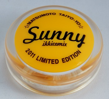 A very unique yo-yo collectable. "Sunny" was a limited edition Volume 1 of Taiyo Matsumoto's manga series that was released in Japan. It included a slimline yo-yo created exclusively for the series. A unique yo-yo with a yellow and black body and clear rims. The yo-yo also came with an accompanying booklet filled with the author's manga artwork of the book's characters using the same yo-yo. There were six volumes in the Sunny series. Notice the play on Matsumoto's name imprinted on the yo-yo.