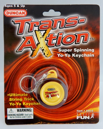 A miniature of the Duncan Trans-Axtion yo-yo on a keychain. The yo-yo is supposed to really work. The full-size Trans-Axtion yo-yo was Duncan's first new yo-yo in more than 20 years.