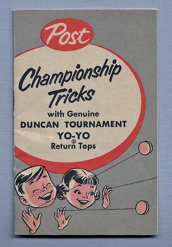 A diminutive Duncan Championship Tricks yo-yo booklet featuring Duncan's Mr. Yo-Yo. From about the late 1950s to early 1960s. These booklets were made available by Post cereals. It may have been free inside cereal boxes or it may have been a mail-away promotional item that also came with a wooden Duncan "Rainbow Tournament" model (nearly identical to the Duncan "Super Tournament" model but stamped with "Rainbow" instead of "Super") that had a fade of half red/white halves. I have yet to locate a picture of the cereal box associated with this booklet and the yo-yo. The booklet itself described many original yo-yo tricks that have been the core of yo-yo play for more than 80 years.