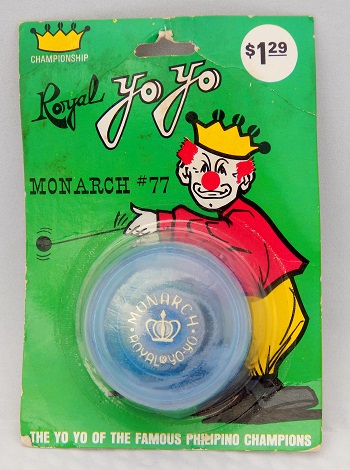 Royal "Monarch" plastic yo-yo, model 77 with text and a one-point crown hot stamped on the yo-yo and a five-point crown printed on the card. The Monarch is from the early 70s and came in various translucent and solid colors. At the time, Royal was operating out of 503 Main street, Covington, Kentucky.