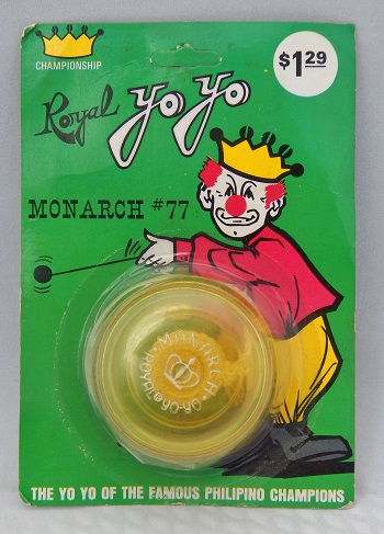 Royal "Monarch" plastic yo-yo, model 77 with text and a one-point crown hot stamped on the yo-yo and a five-point crown printed on the card. The Monarch is from the early 70s and came in various translucent and solid colors. At the time, Royal was operating out of 503 Main street, Covington, Kentucky.