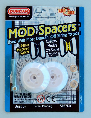 The Duncan MOD Spacer kit 5158PK included a long axle screw, two metal bearing spacers, and two plastic MOD Spacers. The MOD Spacers used their molded-in 4-hole response system instead of silicone response pads. Because this kit does not come with a bearing like the Duncan MOD Spacer kit model 5158PK, you must use the bearing that already comes with your yo-yo.