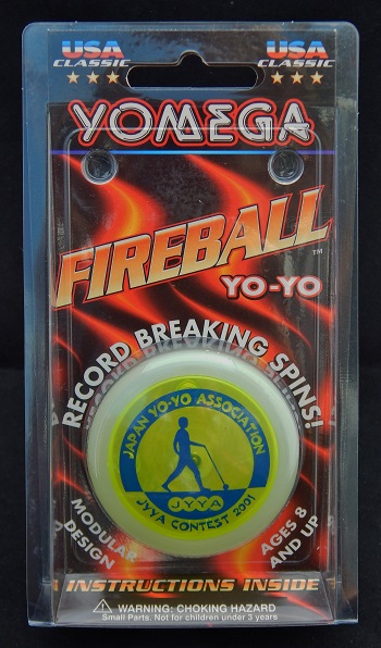 A USA-made Yomega Fireball with glow body and glow sidecaps, made special for the JYYA (Japan Yo-Yo Association) Contest in 2001. Yo-yo has the same specifications as a traditional Yomega Fireball.