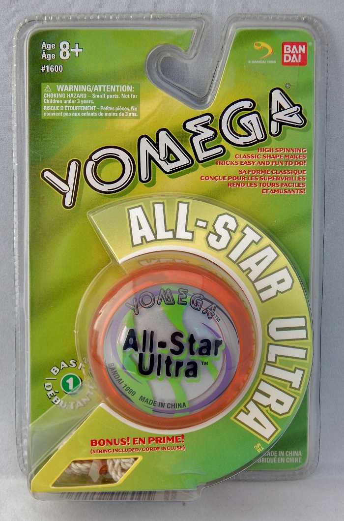 A Yomega yo-yo sold under the Bandai name. This model is a step up from the budget "All-Star" yo also made by Yomega. Comes with extra string. Billed as the "Killer Yomega Classic!" and intended for a beginning yo-yo player or "Trick" level." Used a steel axle.