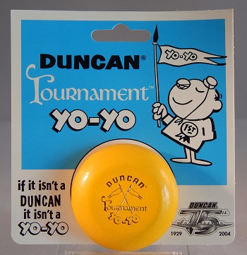 A reproduction of the Duncan "Crossed-Flags" Tournament that was popular in the early 60s. The yo-yo was made to celebrate the 75th Anniversary of Duncan Yo-Yos. Unlike other yo-yos of the time that were made from two wooden halves glued to a wooden axle, this yo-yo model was constructed from one piece of wood. It was manufactured by Elfverson of Sweden. Elfverson is the second oldest manufacturer of wooden yo-yos (I think since 1932) next to Duncan. They manufactured many of the popular yo-yos used in the past 50 years for such famous names as Cheerio, Royal, Festival, Canada Games and others.