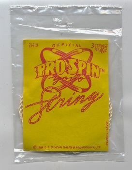 A hard to find string pack sold by D.F. Duncan Sales & Promotions, Ltd.. Their yo-yo product line included the Pro-Spin Stinger, Pro-Spin Slinger, and the Pro-Spin Olympian. D.F. Duncan Sales & Promotions, Ltd. was the forerunner to Playmaxx.