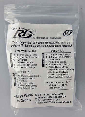 These special kits were designed exclusively for use with the Tom Kuhn RD-1 model of yo-yo. They function to enhance the yo-yo's performance and playability. You could use different combinations of parts from the kit to customize your RD-1 specifically to your own style of play. From weight rings for extended spin times, to rim guards to protect your RD-1 from scratches, to the patented Turbo Disc Response System.