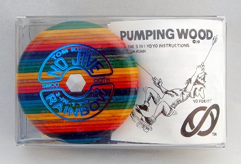 The yo-yo featured the Tom Kuhn patented take apart design with replaceable wood axles, and reversible design. Made from rainbow laminated wood and sporting an impressed blue, purple, to red holographic foil logo. A gorgeous yo-yo that is also hard to find.
