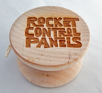 laser engraved with "Rocket Control Panels" on side A; side B has a laser engraved image of a stylized rocket panel that is painted in various colors. Eight were supposedly made. Body of yo-yo is raw, unfinished maple.