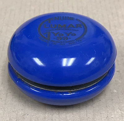 Lumar was a company in the UK that produced yo-yos since the 30's. Lumar produced many tin models, and later plastic. This is an example of their plastic imperial shaped model. Very different than the Duncan's in the USA. This is a hollow shell model and the inner piece is some sort of thin metal sheet material.