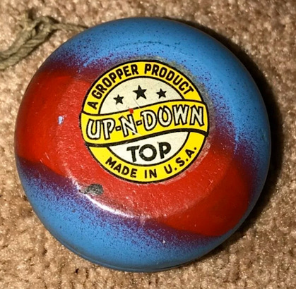 Gropper made several versions of the Up-N-Down. Pictured here is the rarer version. Notice the decal logo, and in excellent condition. Decal logos are difficult to find in very good condition because they crack with time, and wear off easily with play.