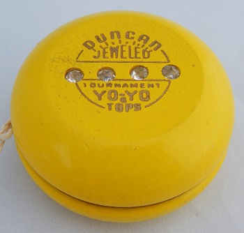 "The original Duncan Jeweled Tournament was one of the most coveted yo-yos of the 1930s, 40s, 50s, and 60s. Although the Jeweled Tournament began production shortly before WWII, the word "Jeweled" did not appear on the yo-yo until 1953. Originally available only as a contest prize, the Jeweled Tournament--even after it was made available for sale--was rare treasure, coveted by boys and girls alike."