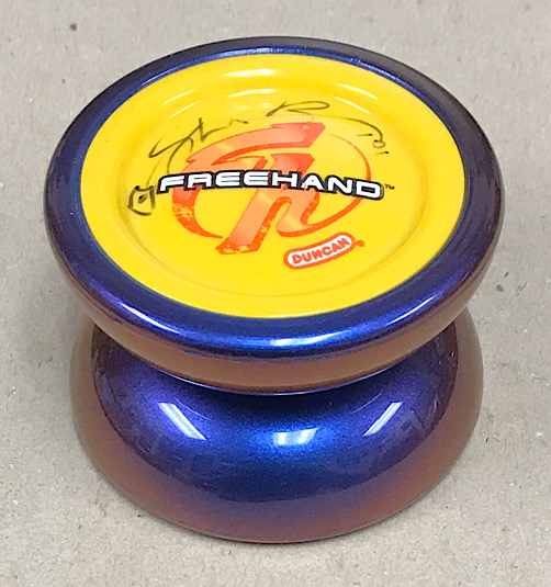 A very special Original Freehand that I purchased from the originator of Freehand play, Steve Brown. Steve tells me that a fan modded this one, with the mirror purple finish and gave it to him at an event. But can't remember more. He autographed it, which you will see on one side, and kept it in his collection for many years. The yoyo body is perfect and beautiful, but the caps show some wear. If anyone knows more about this one, please let us know.