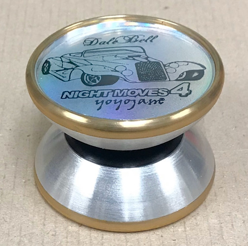 This is pretty one and unique. There were a series of Night Moves yo-yos from Yoyojam. This version was from around 2007. Dale Bell was the owner of yoyojam, and each year participated in a cross county car rally. And often released a Night moves (from the old song) to commemorate the race. Adjustable gap, double yo-ring response, and triple hybrid construction ... the light plastic center with thick aluminum body rims and brass weight rings too.