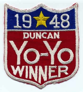 This 1948 Duncan Yo-Yo Winner shield patch marks the first year that Duncan used an embroidered yellow star as opposed to embroidered white star. The white star had been used on Winner patches since 1935. The yellow star would continue to be used on Winner and Champion patches until 1959. In 1958 and 1959, Duncan Yo-Yo Expert patches began to use a blue and a red star, respectively.