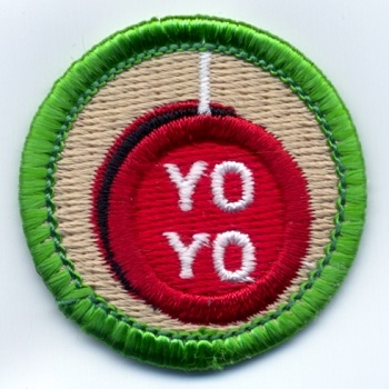 A patch from Eagle Peak spoofing a scouting merit badge for yo-yoing. Patch is the same size as official scout merit badges.