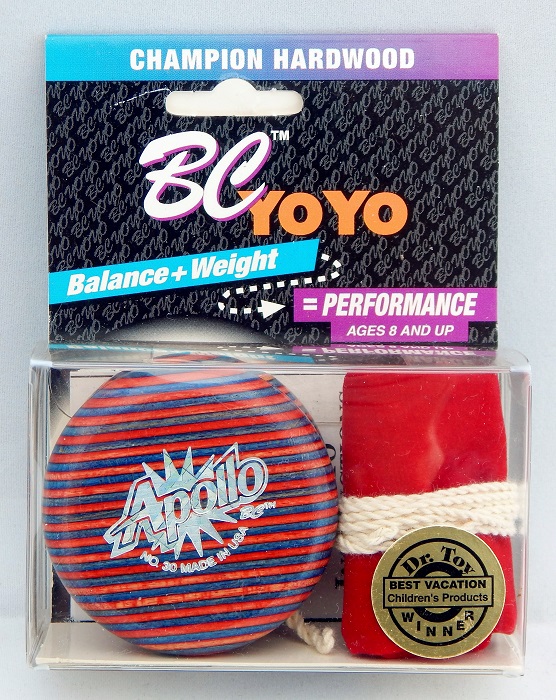 BC Apollo, No. 30, in red, grey, orange, and yellow laminated wood. A fixed axle yo-yo in a concave (aka flying camel, bowtie, or butterfly) configuration. Silver holographic foil seal. Came with one extra string and a red velour pouch.
