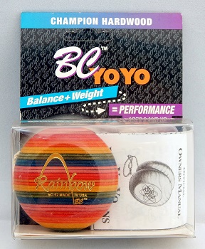 The last version of Rainbow made by BC/What's Next. The Rainbow versions were numbered 49 (1997), 50 (1998), 51 (1999), and 52 (2004; seen in this exhibit). A fixed axle yo-yo in a tournament (aka classic, standard, or imperial) configuration. Gold foil seal. Came with one extra string, a red velour pouch, and a small owners manual. This model is quite difficult to find now. The classic tournament configuration shape continues to be a standard workhorse design by so many yo-yo makers, past and present, including Country Workshop, Hummingbird, BC/What's Next, and now Tom Kuhn, all companies run by Brad Countryman.