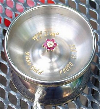 The Titan Gold is a very limited release from YoYoJam. Several prototypes were made, and 10 production models. The body of the yo-yo is machined from titanium. 22 karat gold was used for the weight rings around the rims. Each Titan Gold is was customized for the buyer. This one is a Proto with jewelled cluster, owned by Jim Pankey. Notice "proto" is part of the logo. Adjustable gap with O-Ring response makes this a player, as well as a work of art.