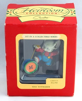 From Carlton Cards Heirloom Collection, the Tiny Toymaker Christmas tree ornament from 1993. A sculpted mouse figure shown yo-yoing with a yo-yo made out of two shirt buttons, all while walking.