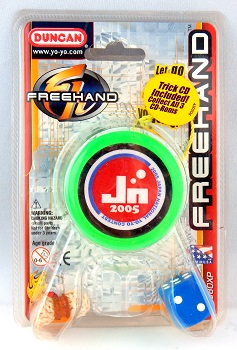 Special edition of an early Duncan Freehand 2 made exclusively for the 2005 Japan National Yo-Yo Contest. These were not sold in the United States. Solid light green body with black/white/blue/red side caps. Blue dice and extra string only; no wide spacers were included in these early Freehand versions.
