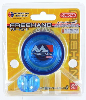The Japanese version of the Duncan Freehand, manufactured by Duncan in the USA, and licensed by Bandai for sale in Japan. Despite the year of release, this model was not a Duncan Freehand Zero. The "HyperYo-Yo" text printed on the yo-yo's side cap simply meant that it was an officially recognized yo-yo for use at any Bandai Hyper Yo-Yo certification center. Japanese yo-yo players could go to any one of these centers to earn awards for successful completion of certain tricks.