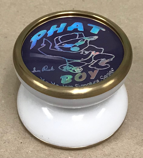 The Phat Boy from Yoyojam was the first truly wide butterfly model from the company. It was a signature model of Rick Wyatt, Sir Rick, as they called him. Super wide body and heavy weight rings made this one a real player for string trick. The sides were the traditional hologram foil on clear that yoyojam used in the early years, the back of the sides were painted to add color variety to the Phat Boy.