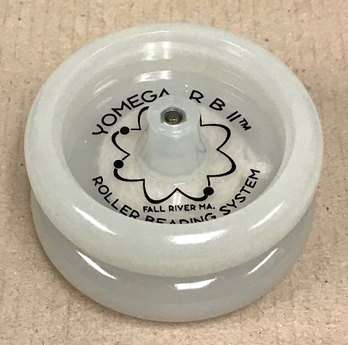 This model--the RB II Roller Bearing Yo-Yo--was the same one used at one time by Jennifer Baybrook, 1998 World Yo-Yo Champion in looping. It is a roller bearing yo-yo like the Yomega Raider, but is supposed to deliver maximum spin times because of the size E ball bearing. This roller bearing yo-yo, with a precision "scooped out" design, is lighter in weight compared to the Raider. At the time, it was recommended for advanced players and intermediate players with advanced skills.