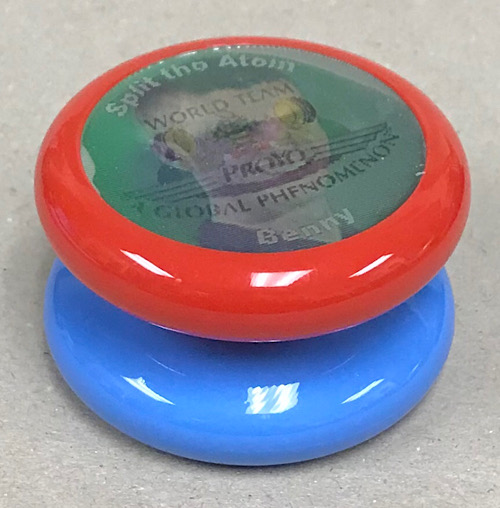 In 2000, I asked the owner of Proyo why there had never been a GT or butterfly version. He responded with this model, sold only thru my store, only 50 made. The GT version were made using prototype color halves, cornflower blue and red. Also, for the special release, Playmaxx included the complete set of "magic motion" lenticular sides. There were 10 in the set, 2 of each World Team Proyo member ... Yohans, Higby, Kate Miller, Ben, and Julius. So you could choose your favorite demonstrator or trick when assembling your yo-yo. |  |