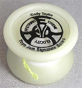 The Evo was a very short lived offstring yo-yo from YoYoJam. The body was a very soft rubberized plastic, with the latest Double Yo-Ring response system. The letters in EVO stood for Extreme Velocity Offstring. This signature model of Cody Taylor was discontinued after the first run in favor of other Offstring models.