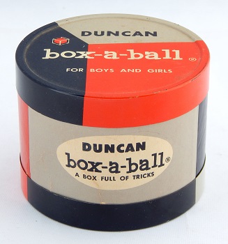 A Duncan toy likely from the 1960s. Little is known about this unusual product. It contained a rubber ball that was attached to a length of rubber line much like those found on paddle ball toys. The rubber line was attached to the inside bottom of the cup. You removed the lid and, while holding the cup, you launched the ball up into the air and tried to catch it in the cup. Of course, there were variations such as bouncing the rubber ball off the floor or off a wall and catching it again in the cup.