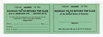 Official Duncan Yo-Yo Return Top Club membership card from the very early 1960s. Opposite side is blank.