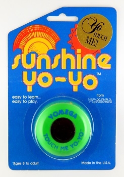 The Yomega Sunshine Yo-Yo, first released in 1989, was also known as the Touch Me Yo-Yo. It was a fixed, metal axle yo-yo with a plastic body, and a heat sensitive disc in the middle of the face of each halve. Similar to mood rings from the mid 70s, when you touched the disc with a finger, the disc changed different colors depending on how warm or cool your finger was.