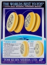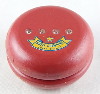 A one-piece maple wood Royal yo-yo from the late 1940s or early 1950s. One of the few Royal yo-yos that did not use a royal crown in the stamp or, in this case, the decal. There are four "jewels" on each halve of this simple but beautiful yo-yo in a classic tournament shape.