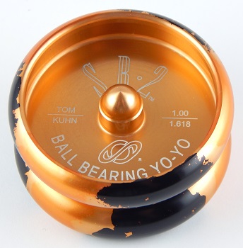 A Tom Kuhn SB-2 prototype known as Bamboo. Unusual coloring of copper, orange, and black. Made in 2013, the yo-yo's colorway was a prototype 1 of 3 test run that was never put into production. The yo-yo came in a display box with the Tom Kuhn The Art of Play booklet, certificate paper, carrying case, two weight rings, gap adjustment tool, Dr. Yo's linen Turbo Discs, and extra cotton string. Uses a size I ball bearing axle.