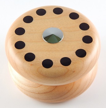 "Made from maple with 12 ebony wood circles on each side. This ball bearing yo-yo is shaped in the classic standard style. Silky smooth to the touch, the yo-yo has an all natural finish of mineral oil followed up by a buffing with carnuba wax. The yo-yo is approx. 2-1/4” diameter [57.15 mm] and weighs 2.6 ounces [73.71 gm].