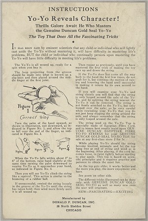 This is an ad sheet from the 1930's, to promote the Gold Seal line of yo-yos. A fascinating printed item. Descriptions and tips on the front. Some tricks and a very nostalgic poem on the back. Overall in very good condition, although faded yellow with age.