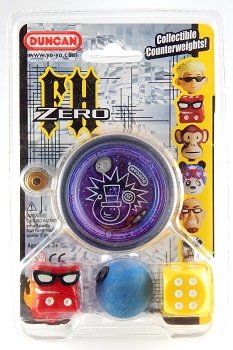 The FreeHand Zero was an updated and improved version of the original Duncan FreeHand. Size A ball bearing axle, take apart design, and Duncan Friction Stickers for response. The string gap was adjustable with two sets of shims provided: silver spacers for standard gap (pre-installed), original response/play; and brass spacers for wide gap (packaged), dead response play. Also came with three collectible counterweights. In this case, a blue rubber bouncy ball, dice with an attitude, and one yellow dice.
