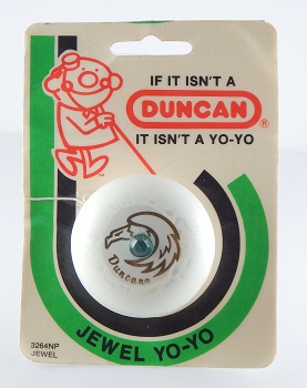 A white, plastic tournament body with gold foil seal of an eagle's head and a faceted, green "jewel" positioned in the center of the yo-yo face; the eagle eye. The 1977 Duncan Action Toys catalog characterized the green, glass jewel as an Emerald. The yo-yo used a fixed, metal axle, and a starburst response. Came with a cotton string.