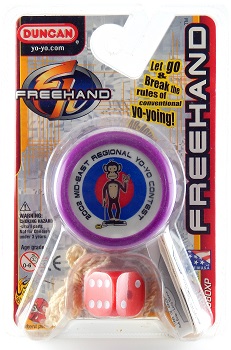Duncan Freehand Original - 2002 Mid-East Regional (MER) Yo-Yo Contest (inauguration year of the contest). Solid purple body with white sidecaps and black, blue, red, yellow, and brown printing. Production number is unknown on this model. One of the very first custom sidecap editions of the new Freehand that was made. The body of this contest model was made using the original Duncan Freehand molds. And, just like the very first Freehand from 2001, this 2002 edition only came with one extra string, one Freehand counter-weight dice, and an instruction sheet. These original Freehand mold yo-yos are much harder to come by nowadays.